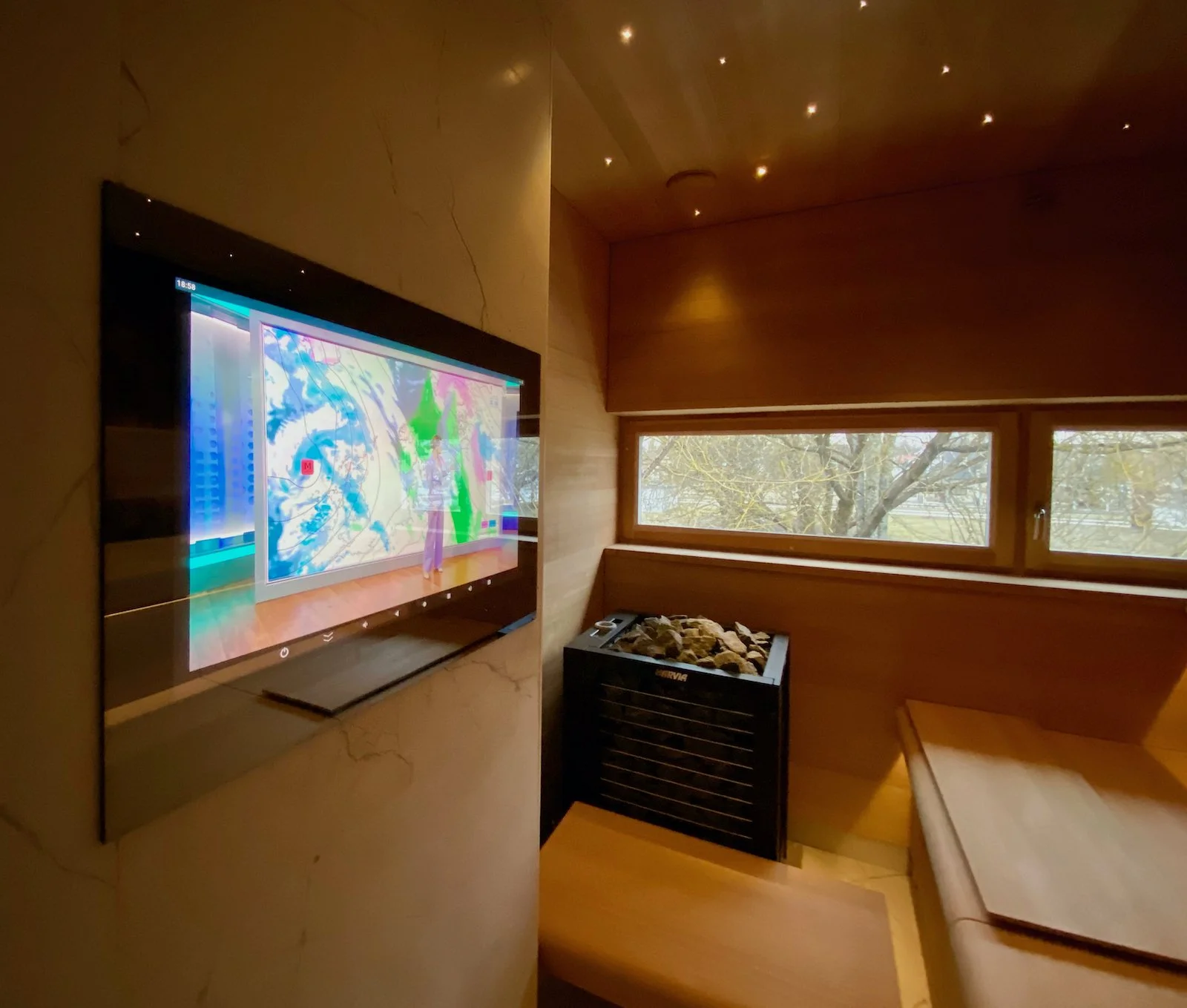 Põneva lahendusena paigaldasime korterisse kuumakindla teleri sauna leiliuumi, kus ekraani eesklaasi temperatuur tõuseb üle 80°C ja ruumi niiskus võib olla üle 90%.
